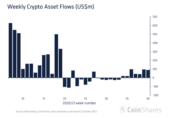 Институциональные инвесторы продолжают проявлять большой интерес к криптовалютам в целом и к биткоину в частности. По данным из отчета управляющей компании CoinShares, за прошлую неделю значительно увеличился приток инвестиций в цифровые активы со стороны различных фондов. Всего за неделю инвестиционные продукты в цифровые активы привлекли более $90 млн.