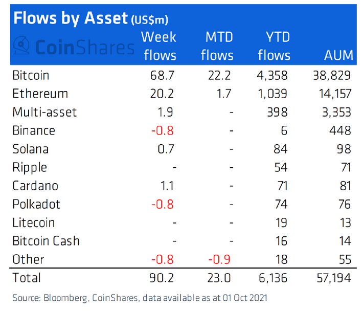 Большая часть из привлеченных средств была вложена в биткоин, приток инвестиций в который составил практически $69 млн. В CoinShares предполагают, что подобный рост связан с увеличивающимся доверием инвесторов к данному классу активов.