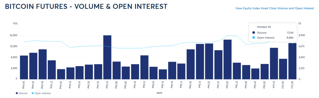 Информацию о растущем спросе на связанные с криптовалютами инвестиционные продукты подтверждает и статистика CME. Данные биржи показывают, что среднесуточный уровень активности трейдеров по фьючерсам на биткоин в третьем квартале вырос на 170% по сравнению с предыдущим кварталом. Начало нового месяца тоже не выбивается из общей картины: по информации с сайта CME, суточные объемы торгов фьючерсами на BTC существенно растут с конца сентября и по состоянию на 5 октября достигли уровня в 13 161 сделок.