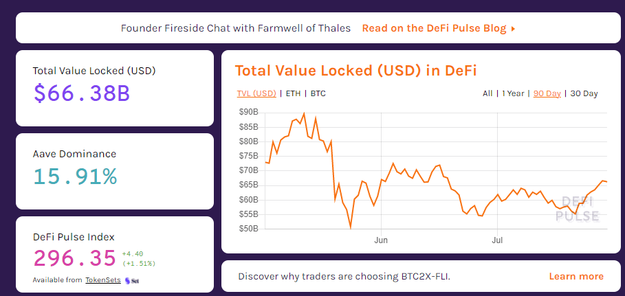 Согласно данным DeFi Pulse, на данный момент в протоколах DeFi находится капитал общей стоимостью $66.38 млрд.