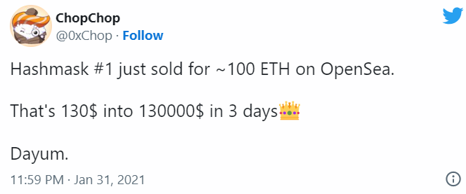 «Хеш-маска была продана за ~ 100 ETH на OpenSea. $130 превратились в $130 000 за три дня». Источник