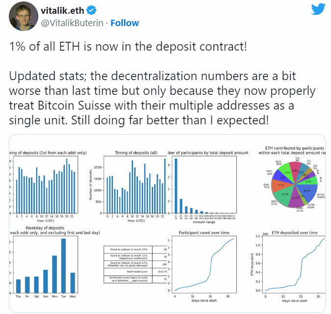 «1% всех ETH в депозитном контракте. Показатели децентрализации хорошие. Это намного лучше, чем я ожидал!». Источник