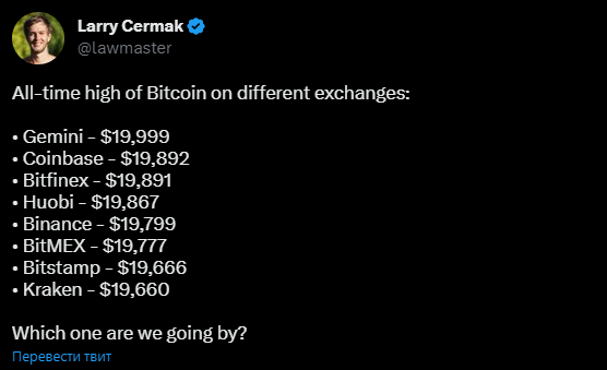 Ларри Чермак из The Block проанализировал данные ведущих бирж и составил свой список ATH. У него получился диапазон от $19 660 (Kraken) до $20 093 (BitMEX).