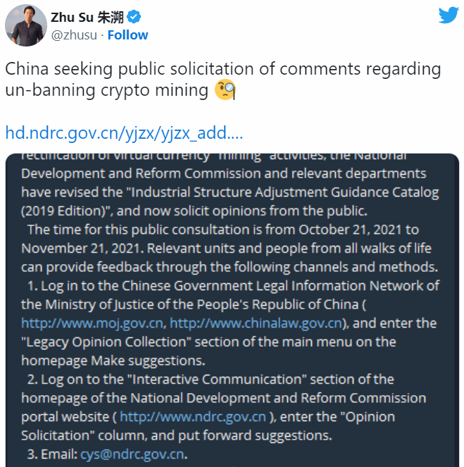 В самой публикации нет никакой информации о снятии запрета на майнинг. В то же время генеральный директор фонда Three Arrows Capital Су Чжу считает, что власти хотят услышать мнение именно относительно снятия запрета.