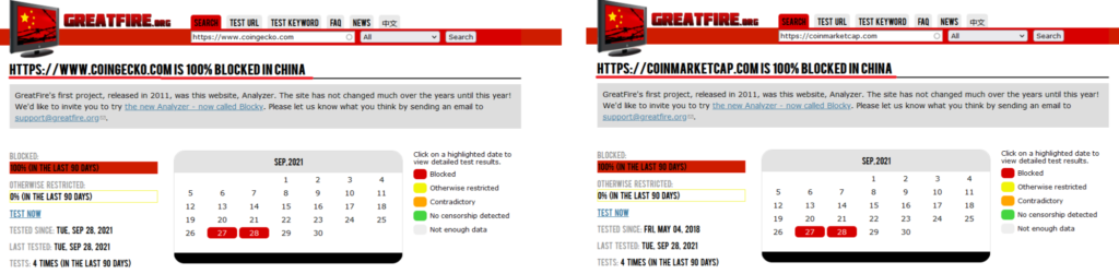 Результаты проверки сайтов CoinGecko и CoinMarketCap на доступность в Китае. Источник.
