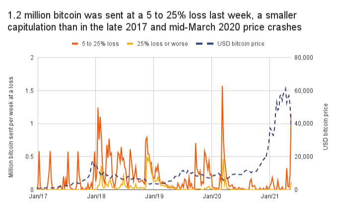 Помимо этого, Chainalysis сообщила, что из-за обвала цен значительное количество биткоинов было продано с убытком. По словам Грэдвелла, 1.2 млн BTC были перемещены во время падения с потерей 5–25%, а 120 000 BTC перевели с потерей 25% и более.