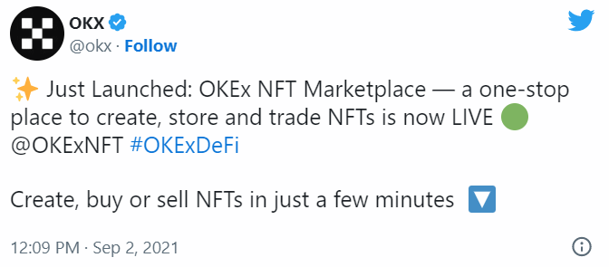 «Только что запущено: OKEx NFT-маркетплейс — универсальное место для создания, хранения и обмена NFT уже РАБОТАЕТ!». Источник