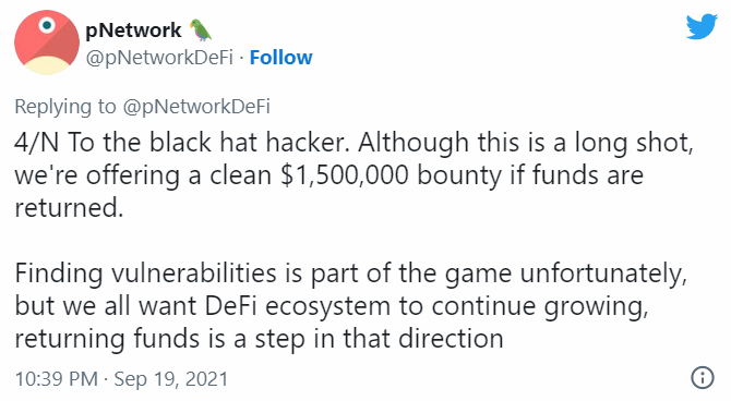 В свою очередь, представители pNetwork предложили хакеру вознаграждение в размере $1.5 млн (11.5% от суммы кражи), если он вернет похищенные средства.