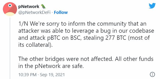 Кроссчейн-платформа pNetwork, работающая на базе Binance Smart Chain, подверглась взлому, о чем компания сообщила в своем Twitter. Воспользовавшись ошибкой в коде, хакер смог украсть 277 pBTC (токенизированный биткоин) на общую сумму около $12.7 млн.
