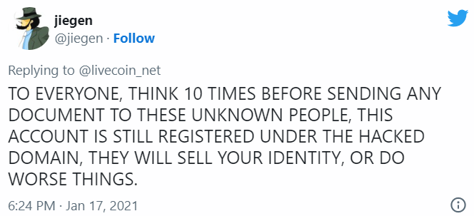 «Ни в коем случае не отправляйте никому свои деньги. Для получения компенсации не нужно никому ничего платить. Если от вас требуют заплатить какую-то сумму, это мошенники. Напишите на почту verification@livecoin.news и следуйте дальнейшей инструкции», — также сообщают представители биржи.