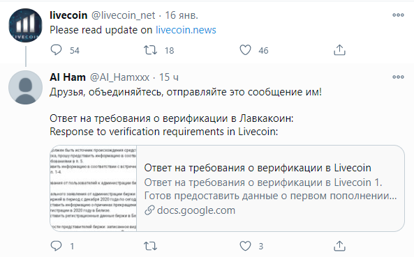 Сообщение пользователя Livecoin с требованием официального видеообращения со стороны руководства. Источник