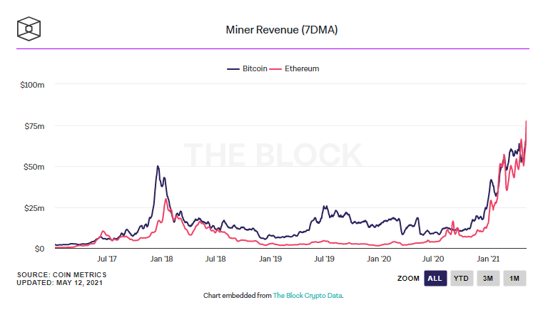 В течение последних 7 дней средняя дневная доходность майнеров ETH составляет $77 млн. В случае с биткоином показатель ниже на $10 млн — майнеры первой криптовалюты получают $67 млн ежедневно.