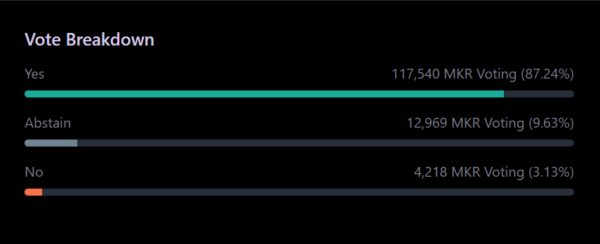 MakerDAO – это децентрализованная автономная организация, которая является эмитентом стейблкоина DAI. В голосовании за открытие хранилища для Huntingdon Valley Bank приняло участие 134 727 MKR, из которых 117 540 MKR (87.24%) были ЗА предложение.