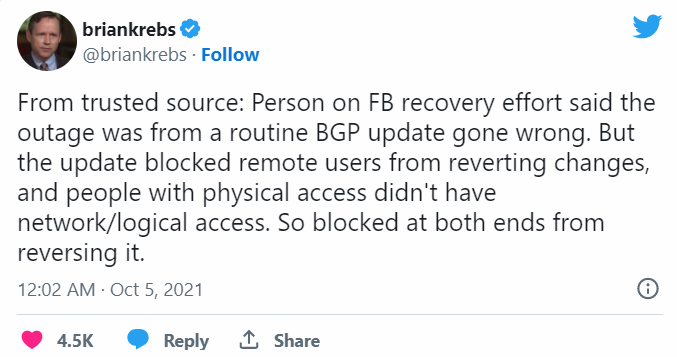 «Информация из достоверного источника: человек, участвовавший в восстановлении Facebook, сказал, что причиной сбоя стало стандартное обновление BGP, которое пошло не по плану. Из-за обновления был заблокирован доступ удаленным пользователям, а люди с физическим доступом не имели сетевого/логического доступа». Источник