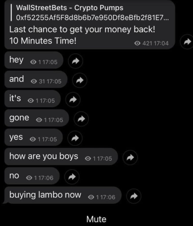 Неизвестные лица создали в Telegram группу от имени WallStreetBets, назвав ее «WallStreetBets — Crypto Pumps». В ней они предлагали инвесторам купить токены WSB Finance еще до листинга на биржах. Эти токены должны были приносить ежедневную прибыль в размере 1 000% или даже больше.
