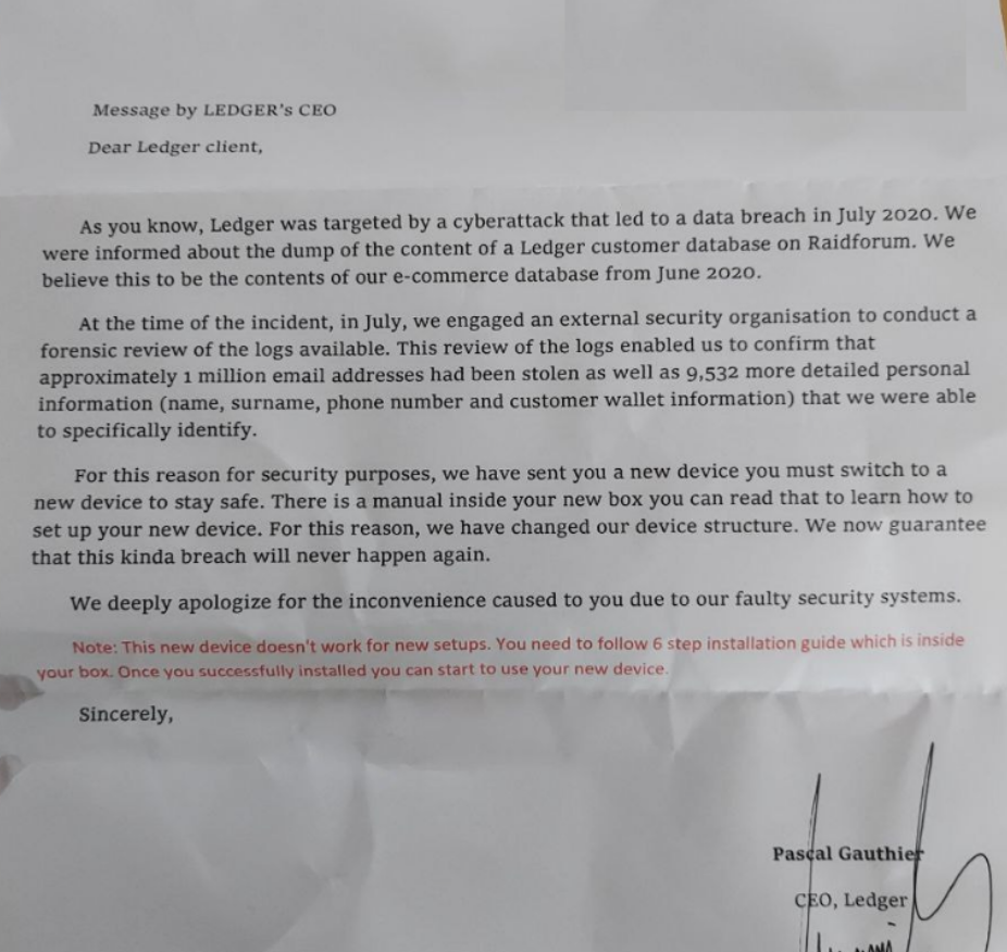 Вместе с кошельком было отправлено сопроводительное письмо якобы от имени генерального директора Ledger Паскаля Готье: