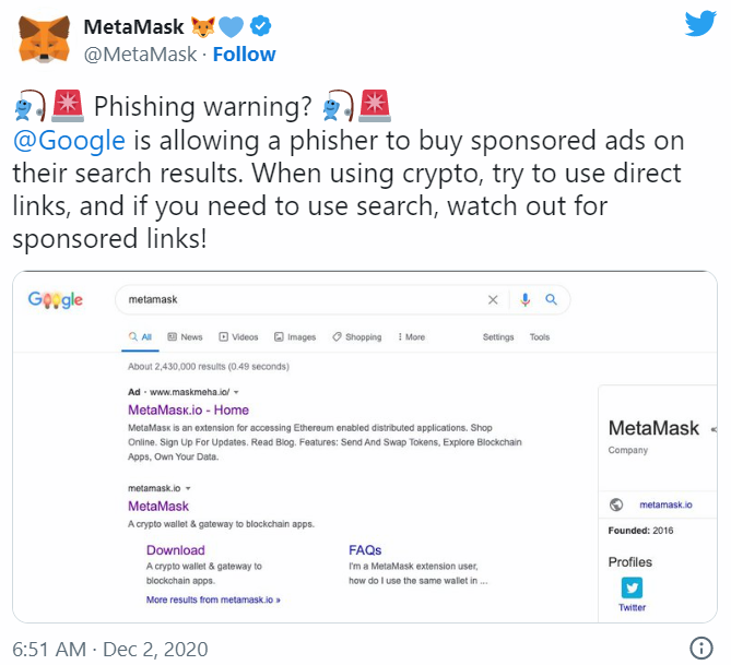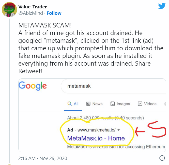 Представители MetaMask сообщают, что в Google действительно появляется реклама мошеннических сайтов после соответствующего запроса. Разработчики рекомендуют использовать только прямые ссылки, а к информации из поисковиков относиться очень внимательно.
