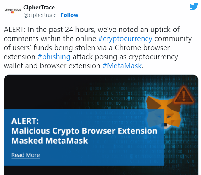 Аналитическая компания CipherTrace сообщает, что за последнее время участились атаки на пользователей MetaMask — криптовалютного кошелька, который может быть использован в браузерах Chrome, Firefox и Brave. Мошенники создают поддельные кошельки, получают данные от аккаунтов и крадут криптовалюту.