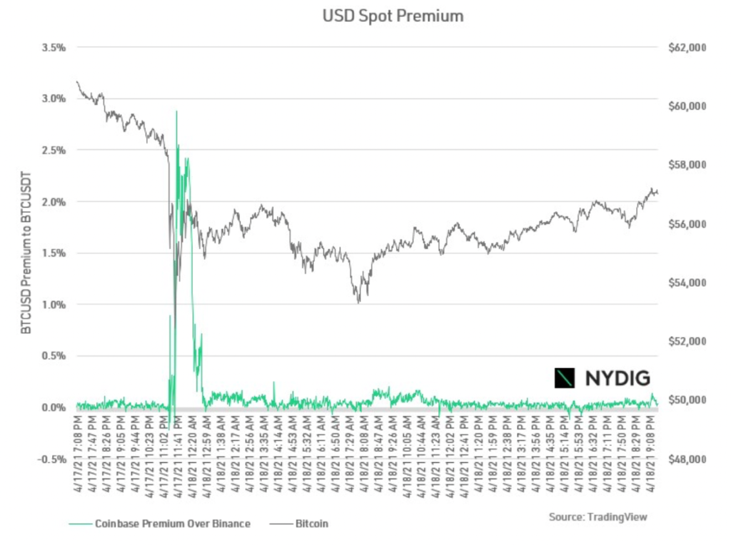 Сиполаро также обратил внимание на так называемую премию Coinbase — это разница между ценой на биткоин на Coinbase и на Binance. В какой-то момент она достигла 3% (на Coinbase стоимость BTC на 3% выше, чем на Binance). Это говорит о том, что продажи осуществлялись преимущественно в Азии, а не в Северной Америке.
