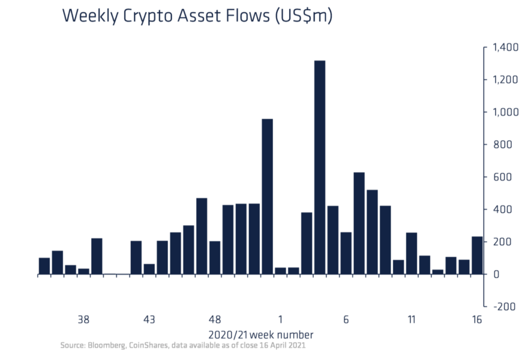 Тем временем компания CoinShares представила свой традиционный еженедельный отчет, в котором рассказала о притоке инвестиций в продукты на базе криптовалют. На прошлой неделе показатель составил $233 млн, что является самым большим значением с начала марта.