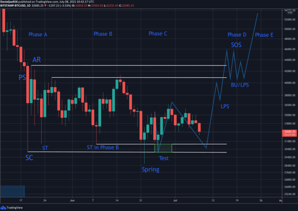 Следующие фазы накопления Вайкоффа пока еще не достигнуты на рынке биткоина. Далее должен снизиться объем торгов, а цена — подняться выше $40 000. Потом случится небольшой откат, который сформирует последний уровень поддержки. И после этого цена начнет повышаться далее.