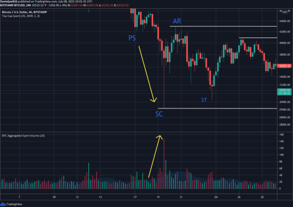 Накопление Вайкоффа начинается после резкого падения цены актива, в нашем случае — биткоина. BTC достиг своего исторического максимума около $65 000 в середине апреля, после чего начал падать. 19 мая была кульминация продаж, когда BTC достиг $30 000. Тогда наблюдались массовые ликвидации длинных позиций, которые открывались с высоким кредитным плечом.