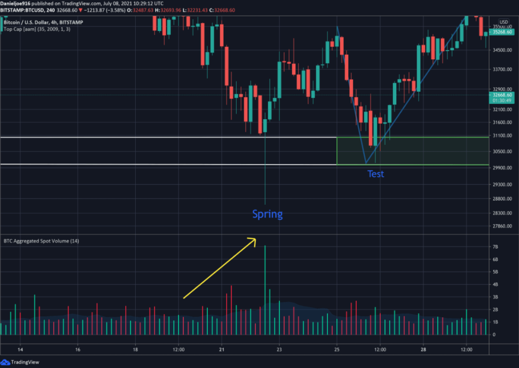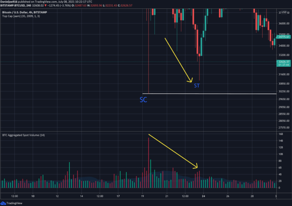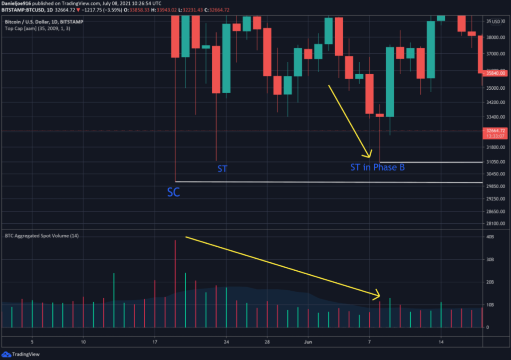 Следующий этап первой фазы — тестирование уровня. В данном случае цена вновь падает к отметке около $30 000, однако с намного меньшими объемами. Это говорит об истощении предложения на рынке.