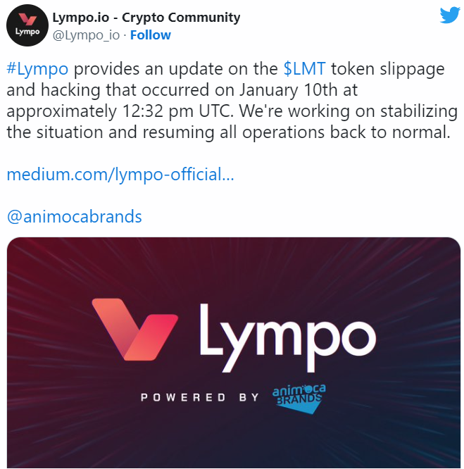 Согласно официальному заявлению Lympo, взлом произошел 11 января в 5:00 МСК, в результате атаки были скомпрометированы десять различных кошельков платформы. Известно, что большая часть украденных токенов была отправлена на один адрес, а затем продана за ETH на биржах Uniswap и SushiSwap.