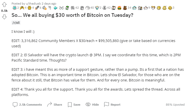 Thadiusb посчитал, что если каждый из 3.3 млн участников форума купит BTC на $30, то создастся предложение на покупку в размере примерно $100 млн. По его словам, он не намерен спровоцировать памп биткоина, а просто хочет поддержать решение Сальвадора.