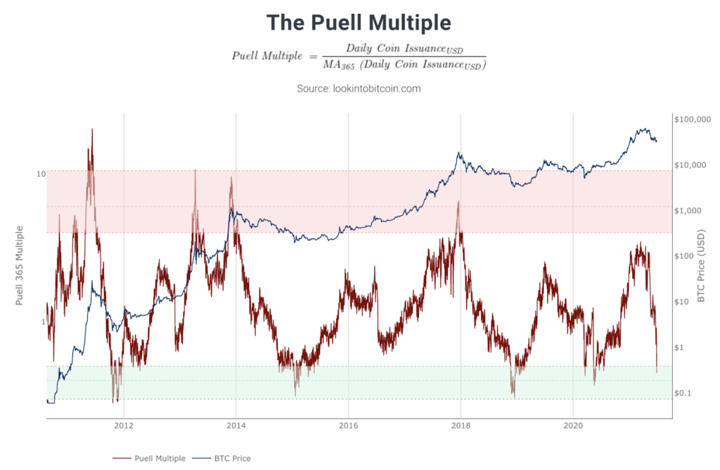 В криптовалютной индустрии есть множество инструментов для анализа будущего ценообразования биткоина, и одним из таких инструментов является коэффициент Пуэлля. Он рассчитывается путем деления дневной эмиссии биткоина в долларах на 365-дневную скользящую среднюю эмиссии.