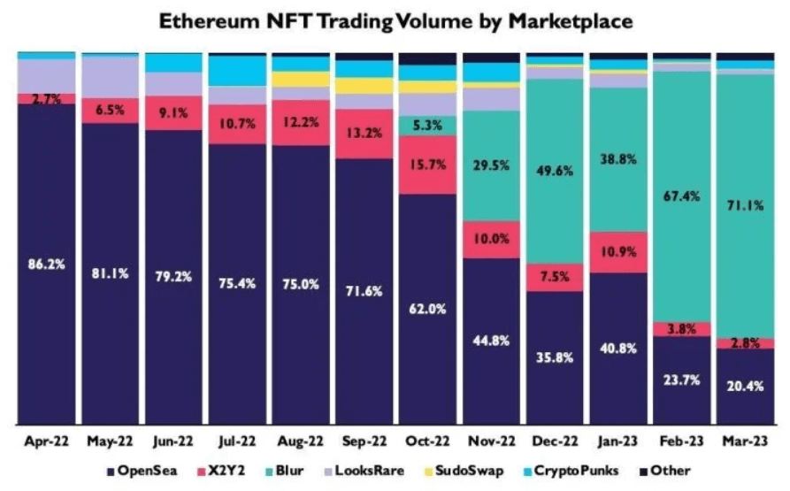 Некогда наиболее популярная NFT-платформа OpenSea в последнее время начала терять первенство в связи с агрессивным маркетингом конкурирующей площадки Blur. Blur обогнала OpenSea по объему торгов, измеряемому в долларах США, благодаря заманчивой программе поощрения, предусматривающей низкие комиссии и раздачу токенов.