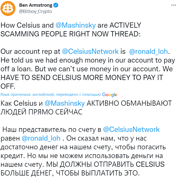 Основатель ютуб-канала BitBoy Crypto Бен Армстронг заявил, что намерен подать коллективный иск против проекта криптокредитования Celsius и его генерального директора Алекса Машинского. Армстронг заявил, что не может погасить кредиты средствами на платформе, поэтому вынужден вносить новые депозиты.