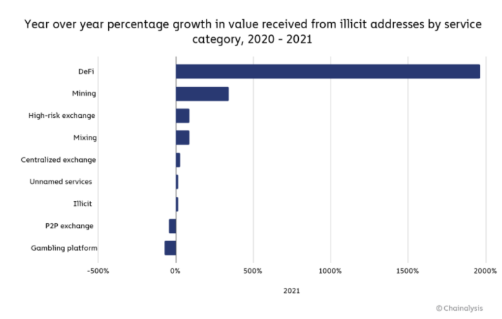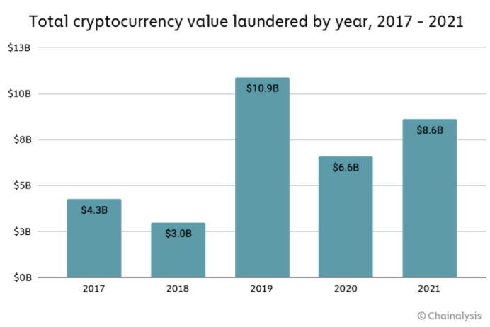 Согласно данным, опубликованным исследовательской компанией Chainalysis, сумма денег, отмытых с использованием криптовалют за 2021 год, составила $8.6 млрд. Аналитики отметили, что увеличение этого значения на 30% по сравнению с прошлым годом «неудивительно, учитывая существенный рост как законной, так и нелегальной деятельности с криптовалютами в 2021 году».