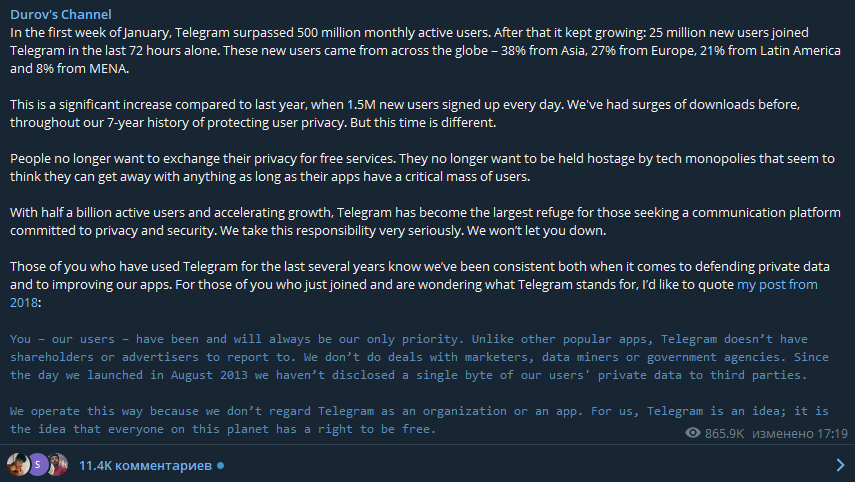 В начале января 2021 года Telegram получил резкий приток новых активных пользователей. Планка превысила 500 млн человек после того, как WhatsApp изменил политику конфиденциальности, а Facebook и Twitter заблокировали аккаунт Дональда Трампа. Павел Дуров всегда отстаивал идею свободного интернета, поэтому его мессенджер активно набирает популярность.