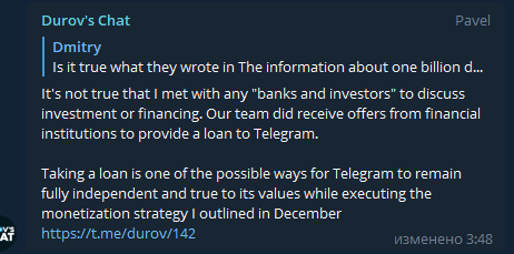 «Я не встречался с какими-то банками или инвесторами для обсуждения инвестиций или финансирования мессенджера. Наша команда действительно получала предложения о предоставлении кредита Telegram. Кредит — это один из возможных вариантов оставаться полностью независимыми и верными своим ценностям».