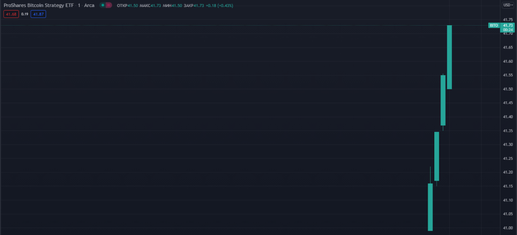Минутный график BITO — первого в истории американского ETF на биткоин (правда не спотового, фьючерсного). Источник