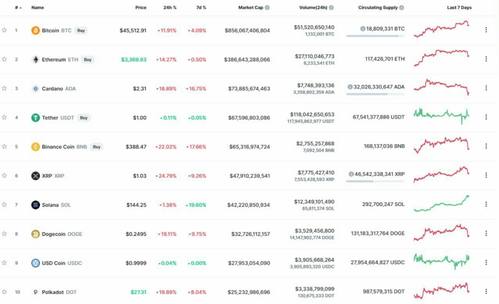 Топ-10 криптовалют во время падения. Источник