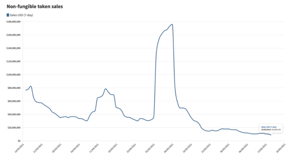 В то же время продажи невзаимозаменяемых токенов (NFT) сократились в 20 раз, свидетельствуют данные аналитического сервиса Nonfungible. Если 9 мая дневной объем продаж NFT достиг $176 млн, 15 июня цифра была уже куда скромнее — $8.7 млн.
