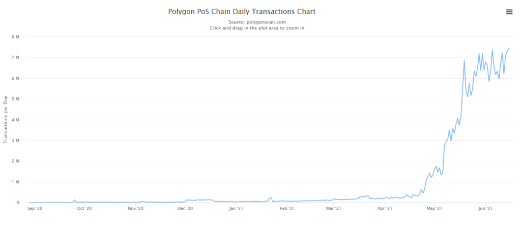 Во-вторых, снижение стоимости газа связано с активным развитием решения второго уровня Polygon (ранее Matic Network). Polygon работает поверх основного блокчейна Ethereum, однако использует алгоритм консенсуса Proof-of-Stake. В связи с этим комиссии в сети значительно ниже, а скорость переводов — быстрее. Согласно данным PolygonScan, на данный момент в сети Polygon осуществляется практически 7.5 млн ежедневных транзакций, хотя еще не так давно показатель был 1.5 млн.