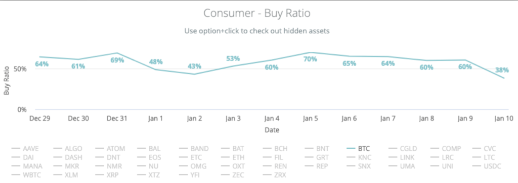 Данные Coinbase сигнализируют о том, что настроения розничных инвесторов, наоборот, пессимистичны. Лишь 38% из них настроены в сторону покупателя.
