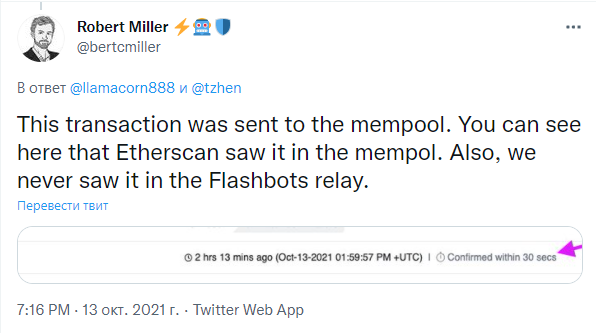 «Эта транзакция сразу была отправлена в мемпул. Мы не видели ее в ретрансляторе Flashbots», — отметил менеджер по продукту Flashbots Роберт Миллер.
