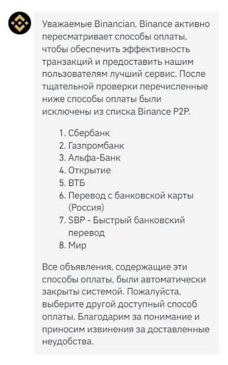 Изначально на платформе пропала возможность покупки криптовалют напрямую с карт банков, попавших под санкции. Однако P2P-торговля оставалась доступной. Спустя время поддержка попавших под санкции банков была убрана и на пиринговой платформе, а 20 марта в сети появилась информация о том, что и ряд других банков и платежных методов убраны с P2P-платформы. Среди них Сбербанк, Газпромбанк, «Альфа-Банк», «Открытие», ВТБ, СБП, «Мир», перевод с банковской карты.