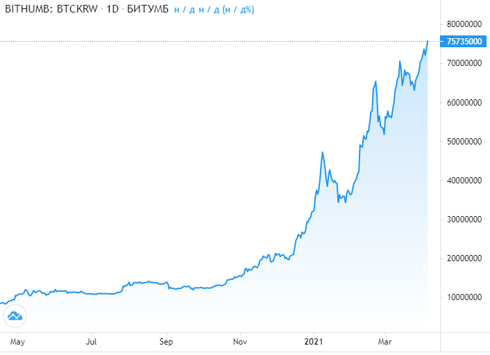 График цены BTC по отношению к южнокорейской воне. Источник