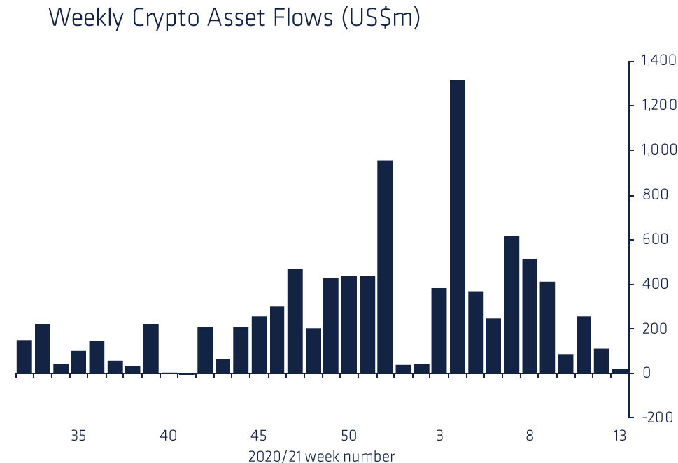 Согласно предоставленным данным, в течение последней недели объем средств, которые поступили в инвестиционные продукты на базе криптовалют, составил $21 млн. В последний раз настолько низкие значения наблюдались в октябре 2020 года. Для сравнения, показатель позапрошлой недели — $99 млн, а рекорд был зафиксирован в январе на отметке $1.3 млрд.