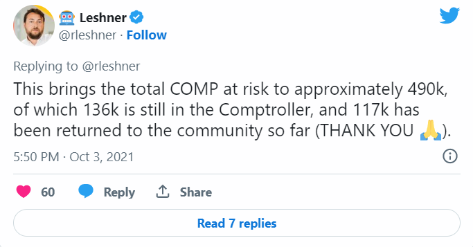 «Суммарно в зоне риска находится 490 000 COMP, из которых 136 000 все еще находятся в Comptroller, а 117 000 уже возвращены сообществу». Источник