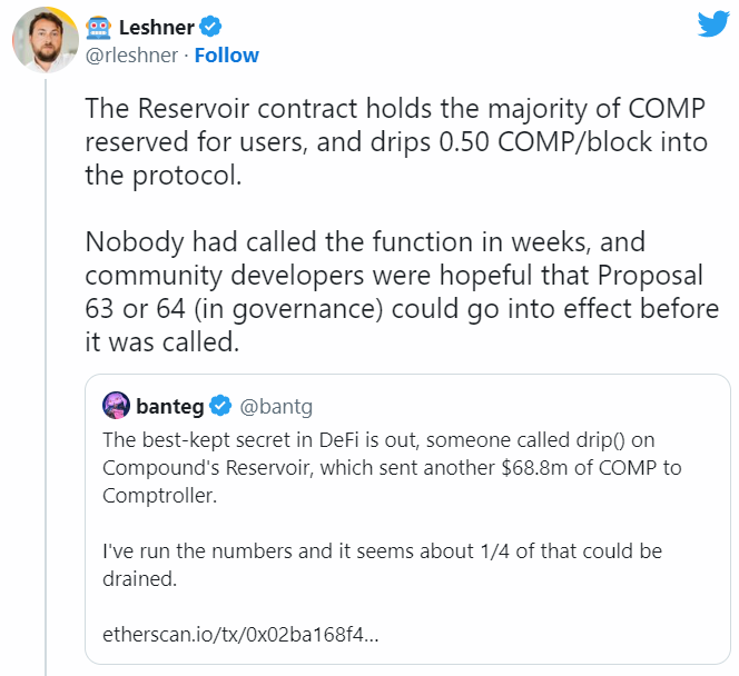 В Compound, естественно, знали о подобной возможности, поскольку функция drip() работает так, как и должна работать. При этом она фактически общедоступна, то есть любой может добавить токены в смарт-контракт, занимающийся распределением средств. Однако все надеялись, что никто не вызовет функцию до исправления бага в коде Comptroller, сообщил в своем Twitter Роберт Лешнер.