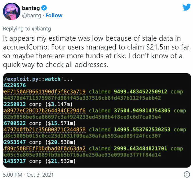 • Смарт-контракт Comptroller продолжает выплачивать пользователям необоснованно большое вознаграждение.
