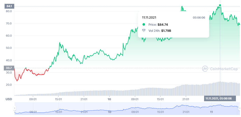 Вскоре после старта кампании по распределению ENS крупнейшая криптобиржа Binance сообщила о листинге токена. Цена после листинга выросла примерно до $70. А в моменте она поднималась до $84.