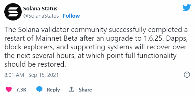 В 09:01 МСК валидаторы закончили перезапуск бета-версии основной сети Solana после обновления ПО до версии 1.6.25.