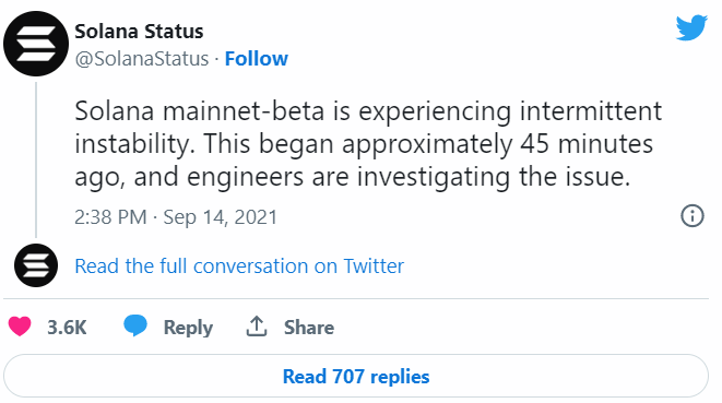 14 сентября примерно в 16:00 МСК неожиданно перестал работать блокчейн Solana. Блоки попросту не добавлялись в сеть. Об этом свидетельствовали данные блокчейн-обозревателя solscan, а чуть позже о возникшей проблеме написал принадлежащий Solana Foundation аккаунт в Twitter.